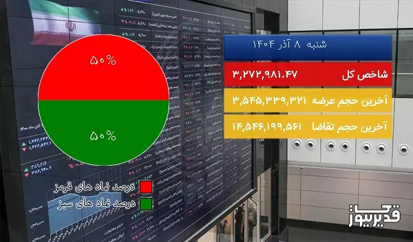 بر اساس اطلاعات منتشر شده از شرکت مدیریت فناوری بورس تهران، در پایان معاملات امروز (شنبه 8 آذر 1404) شاخص کل بورس با افت 9371.12 واحدی به 3,272,981.47 واحد رسید. در این روز، 49.9% از نمادهای معاملاتی در وضعیت مثبت (سبز) و 50.1% در وضعیت منفی (قرمز) قرار داشتند.