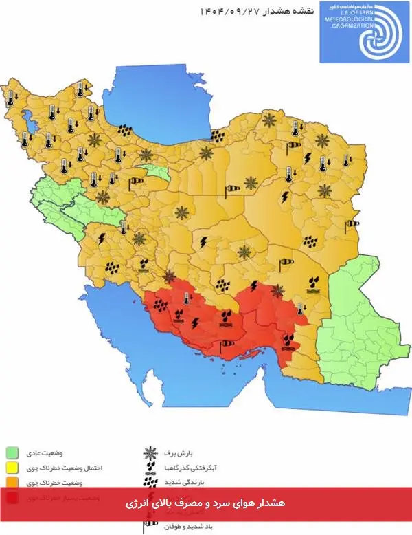 سازمان هواشناسی کشور با صدور هشدار سطح نارنجی ویژه حاملهای انرژی، از نفوذ و ماندگاری توده هوای سرد در کشور از تاریخ 27 آذر 1404 خبر داد. این سامانه جوی از روز پنجشنبه 27 آذر آغاز شده و تا روز یکشنبه 30 آذر ادامه خواهد داشت.