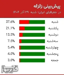 با توجه به تحلیل انجام شده، بر اساس تعداد و زمان رخداد تکانه ها و زلزله های شدید در سال های گذشته، الگوی پیشنهادی احتمال وقوع زمین لرزه در جغرافیای ایران (فلات ایران به همراه بخش هایی از کشور های همسایه ایران) یک الگوی 29 روزه می باشد. ابتدای این الگو جمعه 28 آذر 1404 همراه با رخداد زمین لرزه به بزرگی 4.2 در منطقه عمادده در فارس میباشد. امروز شنبه 29 آذر ماه در روز دوم از الگو قرار داریم که احتمال وقوع یک زلزله با بزرگی ۴ و یا بالاتر در این روز 37.6 درصد است. در جدول زیر احتمال وقوع زمین لرزه در 7 روز آینده را مشاهده می کنید.| تاریخ | احتمال وقوع زلزله |