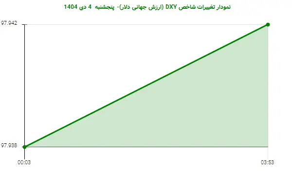 <p>بر اساس اطلاعات منتشر شده توسط سایت Trading Economics، شاخص DXY (ارزش جهانی دلار آمریکا) در پنجشنبه 4 دی 1404 با 97.938 واحد آغاز به کار کرد. طی نوسانات روز، دو خط حمایتی مشخص شدند: خط حمایتی پایین در حدود 97.938 و خط حمایتی بالا در حدود 97.942 واحد. در این روز، بیشتر نوسانات به سمت خط حمایتی پایین حرکت کرد و میانگین روزانه نزدیک به 97.94 واحد باقی ماند. اما در ساعات پایانی روز، شاخص توانست به خط حمایتی بالای خود نزدیک شود و به ارزش 97.942 واحد دست یابد. به طور کلی، روند تغییرات شاخص در این روز به سمت صعودی تغییر کرد که نشاندهنده تقویت موقعیت دلار در بازار جهانی است.