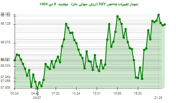 <p>در دوشنبه 8 دی 1404، شاخص DXY که نمایانگر ارزش جهانی دلار آمریکا است، در سطح 98.022 واحد آغاز به کار کرد. بر اساس اطلاعات منتشر شده در سایت Trading Economics، این شاخص در طول روز تحت نوساناتی قرار گرفت که سطح پشتیبانی پایین آن در حدود 97.938 واحد و سطح مقاومت بالا در حدود 98.157 واحد تعریف شد. بیشتر نوسانات در این روز به سمت سطح پشتیبانی پایین متمایل بود و میانگین روزانه در حدود 98.05 واحد ثابت ماند. اما در ساعات پایانی، تحولات نشان داد که شاخص به سوی سطح مقاومت نزدیک میشود و موفق به رسیدن به 98.128 واحد گردید. این روند صعودی در تغییرات شاخص نمایانگر بهبود نسبی ارزش دلار در بازارهای جهانی است.