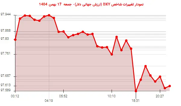 <p>در معاملات روز جمعه، 17 بهمن 1404، شاخص DXY، که نمایانگر ارزش جهانی دلار آمریکا است، با شروعی در سطح 97.83 واحد وارد بازار شد. در طول روز، دو خط حمایتی مشخص برای این شاخص تعیین شد: خط حمایتی پایین در حدود 97.589 و خط حمایتی بالا در 97.944 واحد. نوسانات روز به سمت خط حمایتی بالا بیشتر متمایل بود و باعث شد که میانگین روزانه شاخص در نزدیکی 97.81 واحد باقی بماند. با این حال، در ساعات پایانی، روند بازار تغییر کرد و شاخص نزدیک به خط حمایتی پایین خود کاهش یافت و به سطح 97.613 واحد رسید. این تغییرات نشاندهنده روند نزولی شاخص در پایان روز میباشد. اطلاعات مذکور از سایت Trading Economics استخراج شده است.
