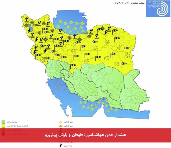 نوع مخاطره: بارش باران و برف، وزش باد شدید موقت و در نواحی مرتفع کولاک برف. همچنین در مناطق گرمسیر احتمال رعد و برق و در نواحی برفگیر کوهستانی احتمال وقوع بهمن پیشبینی میشود.