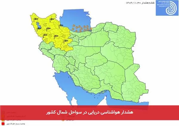 براساس پیشبینیهای سازمان، از شب پنجشنبه 30 بهمن تا ظهر شنبه 2 اسفند 1404 شرایط جوی نامناسبی در مناطق ساحلی و دور از ساحل استانهای مازندران و گلستان برقرار خواهد بود. در این مدت، بیشینه سرعت وزش باد در محدوده 26 تا 32 نات و در برخی مواقع بیش از این مقدار پیشبینی میشود. همچنین، ارتفاع امواج دریا نیز تا 1.8 متر در مناطق ساحلی و بیش از 1.8 متر در مناطق دور از ساحل افزایش خواهد یافت.
