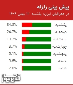 با توجه به تحلیل انجام شده، بر اساس تعداد و زمان رخداد تکانه ها و زلزله های شدید در سال های گذشته، الگوی پیشنهادی احتمال وقوع زمین لرزه در جغرافیای ایران (فلات ایران به همراه بخش هایی از کشور های همسایه ایران) یک الگوی 29 روزه می باشد. ابتدای این الگو یکشنبه 12 بهمن 1404 همراه با رخداد زمین لرزه به بزرگی 5.2 در منطقه عسلویه در بوشهر میباشد. امروز یکشنبه 12 بهمن ماه در روز یکم از الگو قرار داریم که احتمال وقوع یک زلزله با بزرگی ۴ و یا بالاتر در این روز 34.5 درصد است. در جدول زیر احتمال وقوع زمین لرزه در 7 روز آینده را مشاهده می کنید. | تاریخ | احتمال وقوع زلزله |